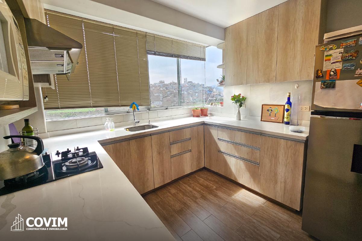 • Cocina americana: mesa de cuarzo y muebles altos y bajos